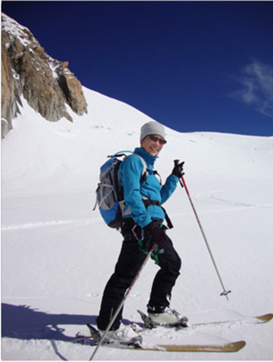 Kiyoko Skiing off the Aiguille du Midi in May on her way to Punta Helbronner, and me ski testing in September, with Mont Blanc du Tacul behind...